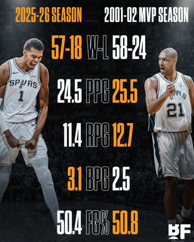 开云下载-邓肯首夺MVP场均25.5分12.7板2.5帽 文班本赛季24.5分11.4板3.1帽
